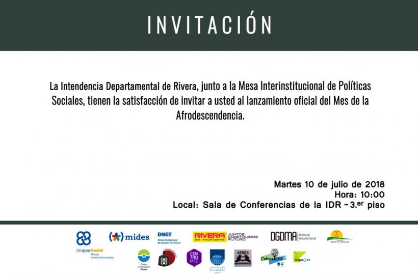 Este martes 10 de julio, se realizará el lanzamiento del “Mes de la afrodescendencia”. La ceremonia comenzará a las 10 horas y tendrá lugar en la Sala de Conferencias de la IDR (Agraciada 570, 3er piso).