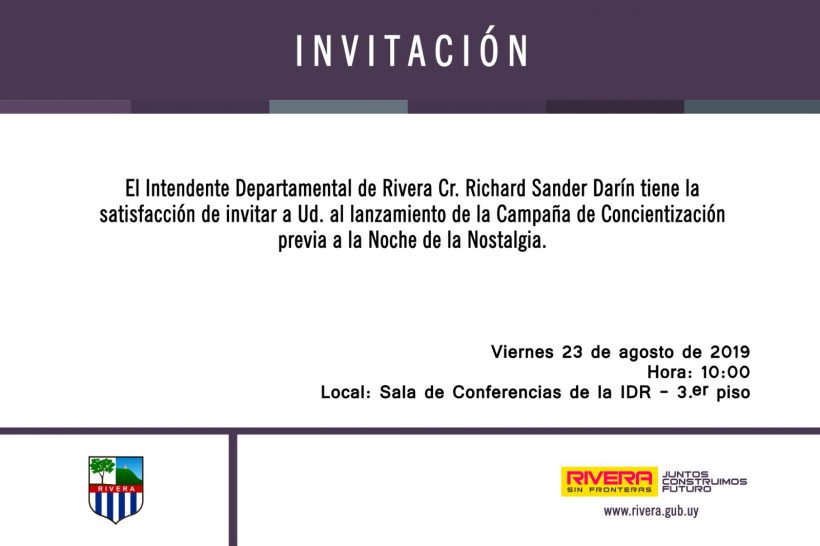 El día viernes 23 de agosto, a la hora 10:00, se realizará en la sala de conferencias de la IDR (3° piso), el lanzamiento de la Campaña de Concientización previa a la Noche de la Nostalgia. El evento contará con la presencia del Intendente Departamental de Rivera Cr. Richard Sander Darín y demás autoridades.