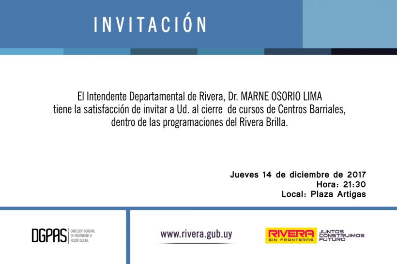 Este jueves 14 de diciembre, el Intendente Departamental, Marne Osorio, estará presente en el cierre de cursos de los Centros Barriales. El evento, realizado en el marcos de Rivera Brilla, tendrá lugar en Plaza Artigas, a las 21:30 horas.