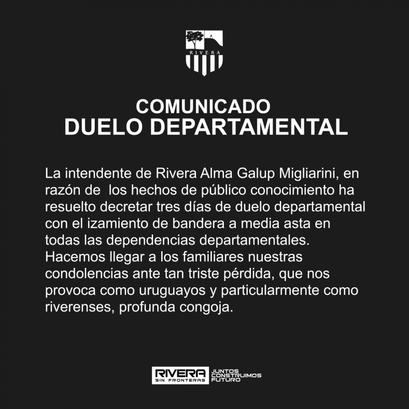 La intendente de Rivera Alma Galup Migliarini, en razón de los hechos de público conocimiento, ha resuelto decretar tres días de duelo departamental con el izamiento de bandera a media asta en todas las dependencias departamentales.