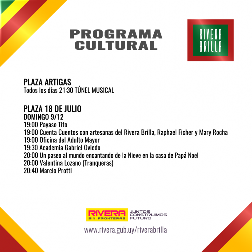 El día domingo 9 de diciembre, en el marco de Rivera Brilla, se llevarán a cabo en Plaza 18 de Julio los siguientes espectáculos: 19:00 Payaso Tito 19:00 Cuenta Cuentos con artesanas del Rivera Brilla, Rafael Fischer y Mary Rocha 19:00 Oficina del Adulto mayor 19:30 Academia Gabriel Oviedo 20:00 Un paseo al mundo encantado […]
