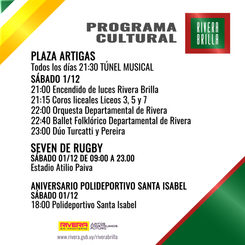 Sábado 1° de diciembre se llevarán a cabo en Plaza Artigas los siguientes espectáculos: 21:00 Encendido de luces Rivera Brilla 21:15 Coros liceales – Liceos 3,5 y 7 22:00 Orquesta Departamental de Rivera 22:40 Ballet Folklórico Departamental de Rivera 23:00 Dúo Turcatti y Pereira Programación completa (descargar)