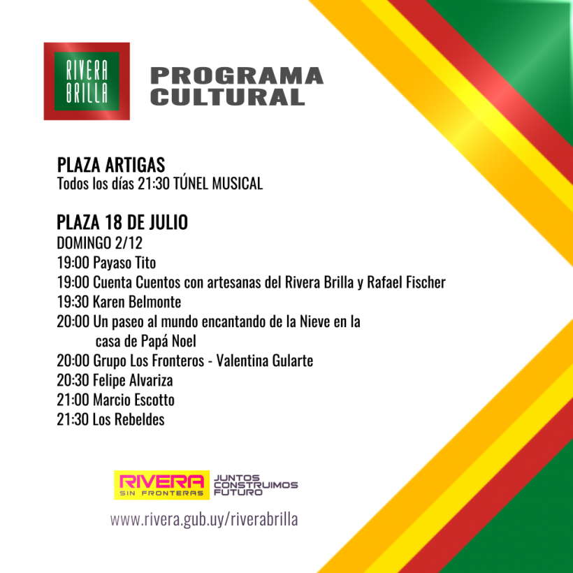 El día domingo 2 de diciembre, en el marco de Rivera Brilla, se llevarán a cabo en Plaza 18 de Julio los siguientes espectáculos: 19:00 Payaso Tito 19:00 Cuenta Cuentos con artesanas del Rivera Brilla y Rafael Fischer 19:30 Karen Belmonte 20:00 Un paseo al mundo encantado de la Nieve en la casa de Papá […]