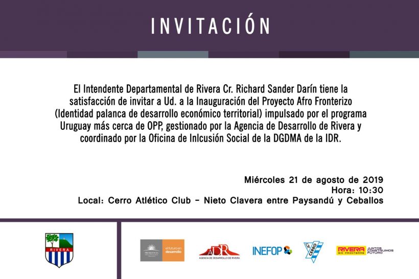 El día miércoles 21 de agosto, a las 10:30 hrs, se inaugurará e Proyecto Afro Fronterizo (identidad palanca de desarrollo económico territorial), con la presencia del Intendente Departamental de Rivera Cr. Richard Sander Darín. Dicho evento se llevará a cabo en el Cerro Atlético Club, calle Nieto Clavera entre Paysandú y Ceballos.