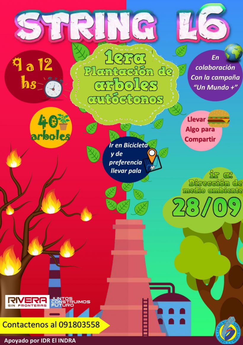 El día 28 de setiembre, de 9 a 12 horas, se llevará a cabo la Primera plantación de árboles autóctonos en colaboración con la campaña “Un Mundo”. Las actividades se iniciarán en Dirección de Medio Ambiente, Bouchacourt 1013 (Estadio Mpal). Ir en bicicleta, de preferencia llevar pala y algo para compartir.