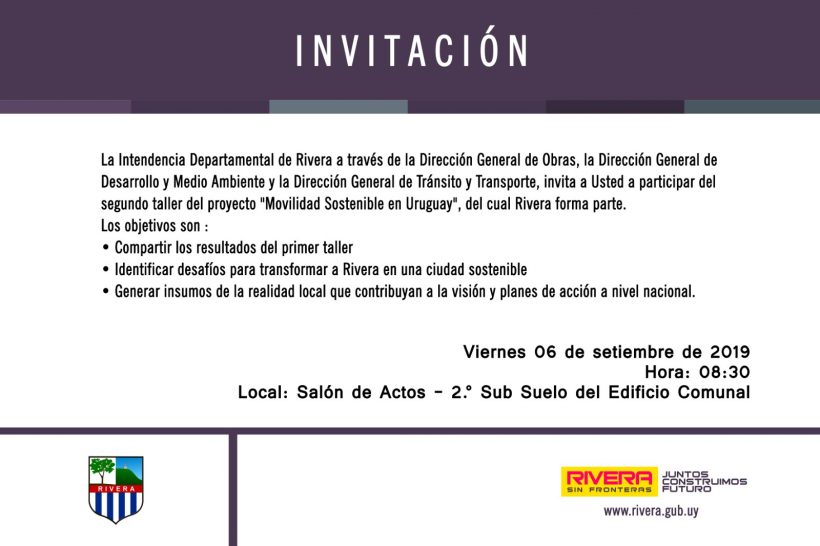 El día viernes 6 de setiembre, a partir de las 08:30, se llevará a cabo el segundo taller del proyecto “Movilidad sostenible en Uruguay” del cual Rivera forma parte. Dicho evento se realizará en el salón de Actos de la Intendencia Departamental de Rivera, 2° sub suelo del Edificio Comunal.