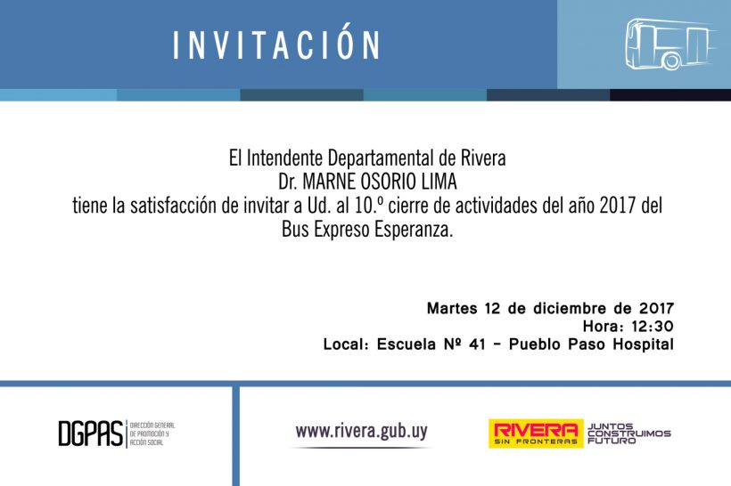 Este martes 12 de diciembre, se realizará el 10º cierre de actividades del Bus Expreso Esperanza. La ceremonia tendrá lugar en la Escuela Nº 41 de Pueblo Paso Hospital, a las 12:30 horas.