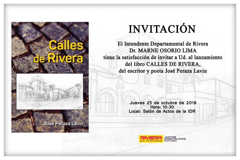 Este jueves 25 de octubre, se realizará el Lanzamiento del libro “Calles de Rivera”, del escritor y poeta José Peraza Lavin. El evento se llevará a cabo en el Salón de Actos de la IDR, a las 10:30 horas, y contará con la presencia del Intendente Marne Osorio.