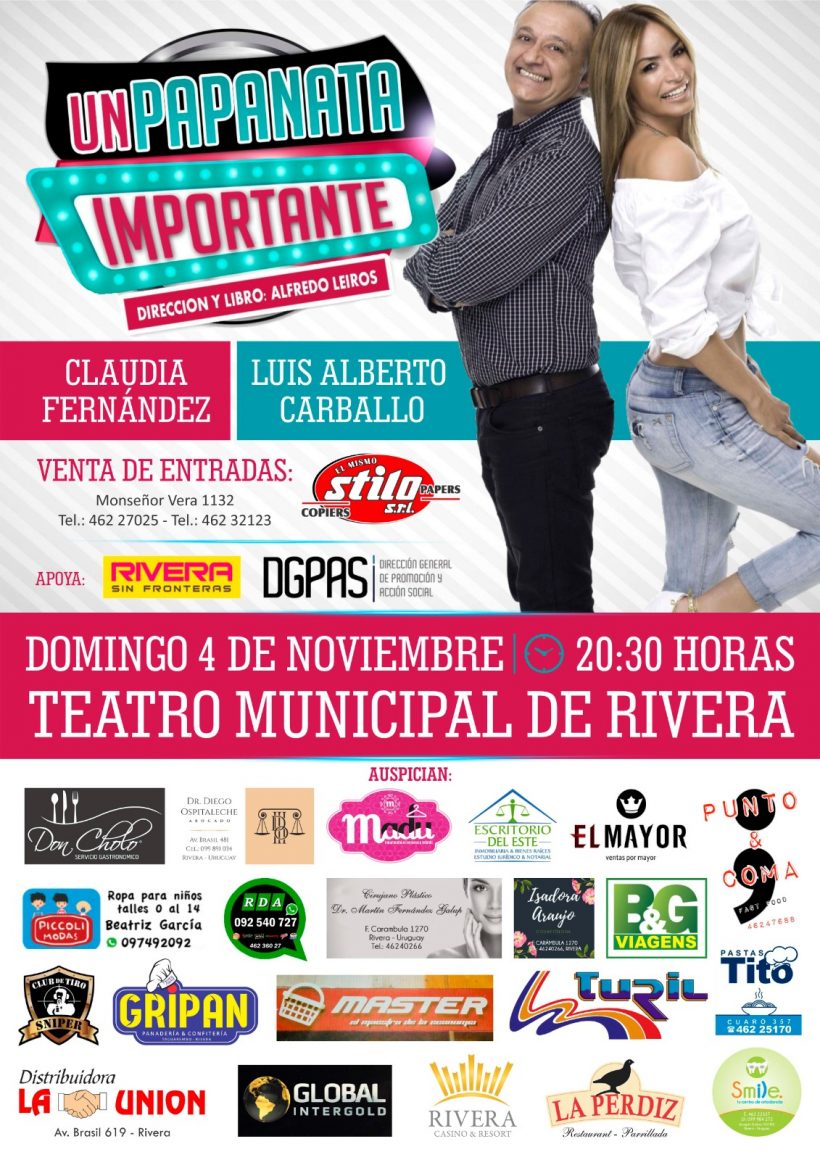 El día 4 de noviembre a las 20:30 horas se presentan en el Teatro Municipal de Rivera Claudia Fernández y Luis Albert Carballo con la obra “Un papanata importante”, dirección y libro de Alfredo Leiros. Las entradas están en venta en Monseñor Vera 1132. Teléfonos para contacto 46227025 / 46232123