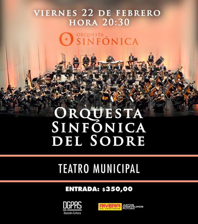 Este viernes 22 de febrero, a las 20:30 horas, se presentará la Orquesta Sinfónica del Sodre. El evento tendrá lugar en el Teatro Municipal de Rivera. Las entradas están a la venta en Casa de la Cultura (Bvar. Pte. Viera, Nº 1084), con un costo de $350.