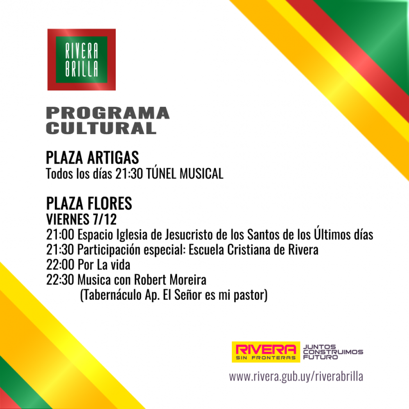 El día viernes 7 de diciembre se llevarán a cabo en Plaza Flores los siguientes espectáculos: 21:00 Espacio Iglesia de Jesuscristo de los Santos de los Últimos días 21:30 Participación especial: Escuela Cristiana de Rivera 22:00 Por la vida 22:30 Música con Robert Moreira (Tabernáculo Ap. El Señor es mi Pastor) Programación completa (descargar)