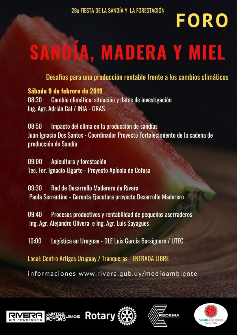 El día 9 de febrero, a partir de las 08:30, se realizará el foro “Sandía, Madera y Miel” , impulsado por Rotary, Redema, proyecto Sandías de Rivera e Intendencia Departamental de Rivera. Las actividades tendrán lugar en el Centro Artigas Uruguay de Tranqueras. Dicho evento se enmarca en la 28° fiesta de la Sandía y […]