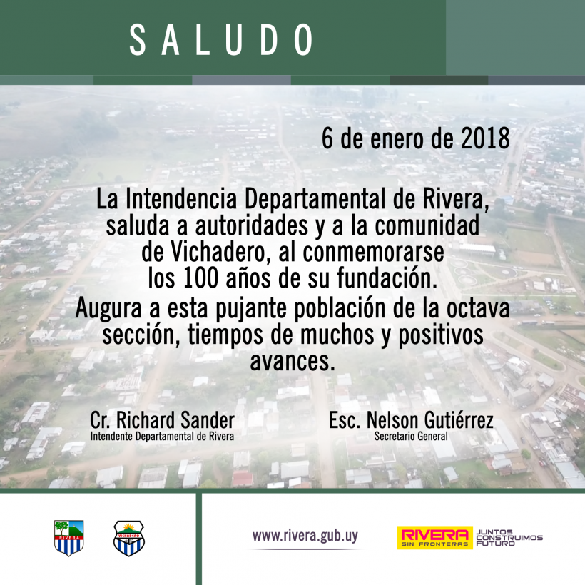 Este domingo 7 de enero, se realizará el cierre de las festividades por los 100 años de Vichadero. El evento, considerado de interés Departamental y Nacional, contará con la presencia del Intendente (i) Richard Sander y tendrá lugar en el centro de la localidad, a partir de las 9 horas.