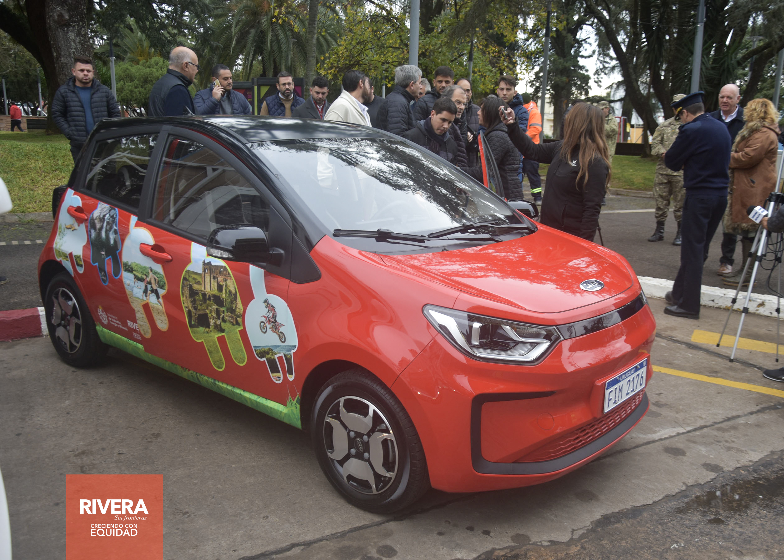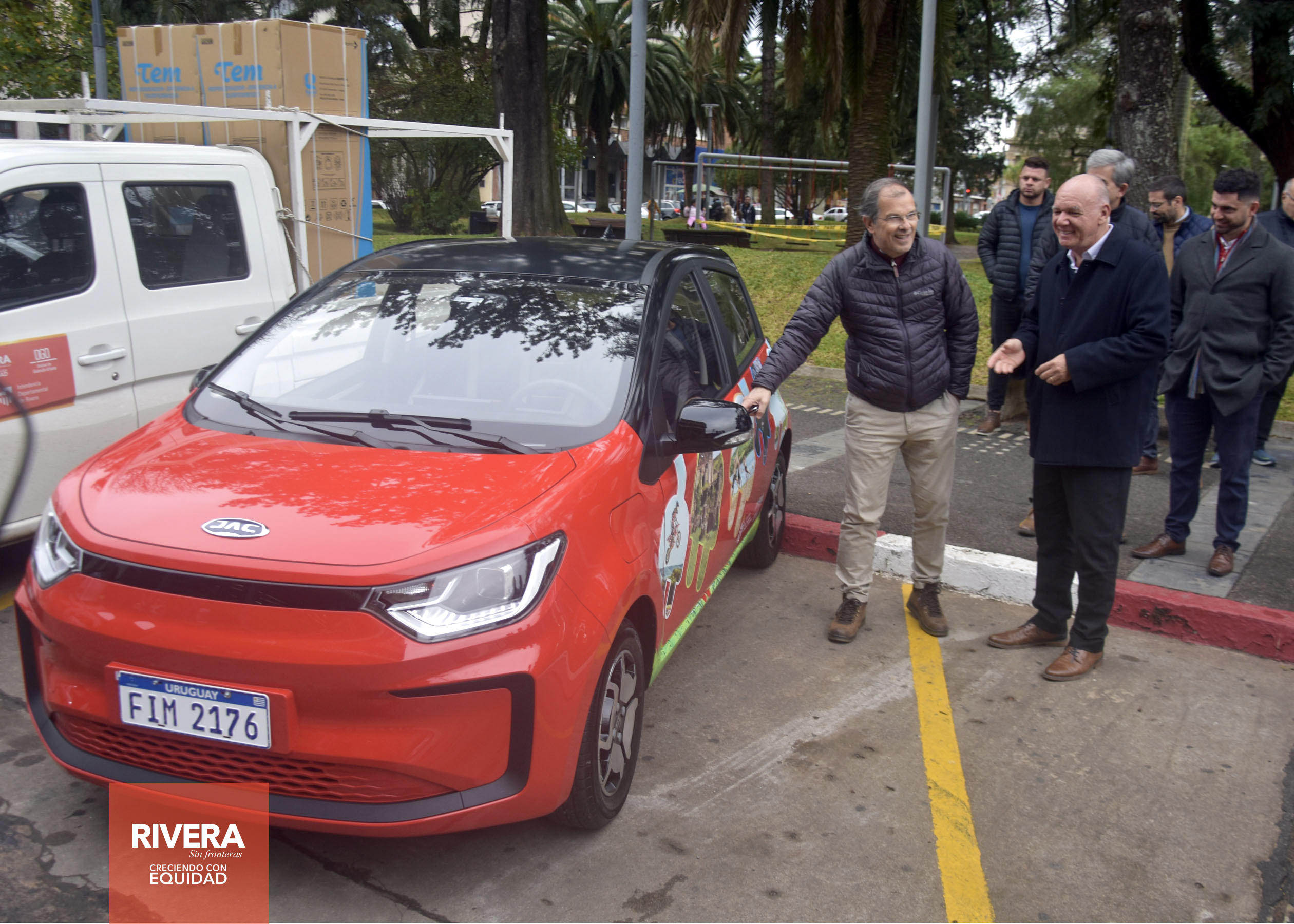 El Intendente Departamental de Rivera, Cr. Richard Sander recibió esta mañana de manos del Subsecretario del ministerio de Industria, Energía y Minería, Walter Verri, las llaves del automóvil eléctrico que se ha integrado a la flota municipal, dentro de los planes de Eficiencia Energética que ha adoptado nuestra comuna, en este caso aplicados al Turismo. La movilidad y la calidad de vida van de la mano en los Programas “Localidades Eficientes Turísticas” y “Localidades Eficientes Sociales”.