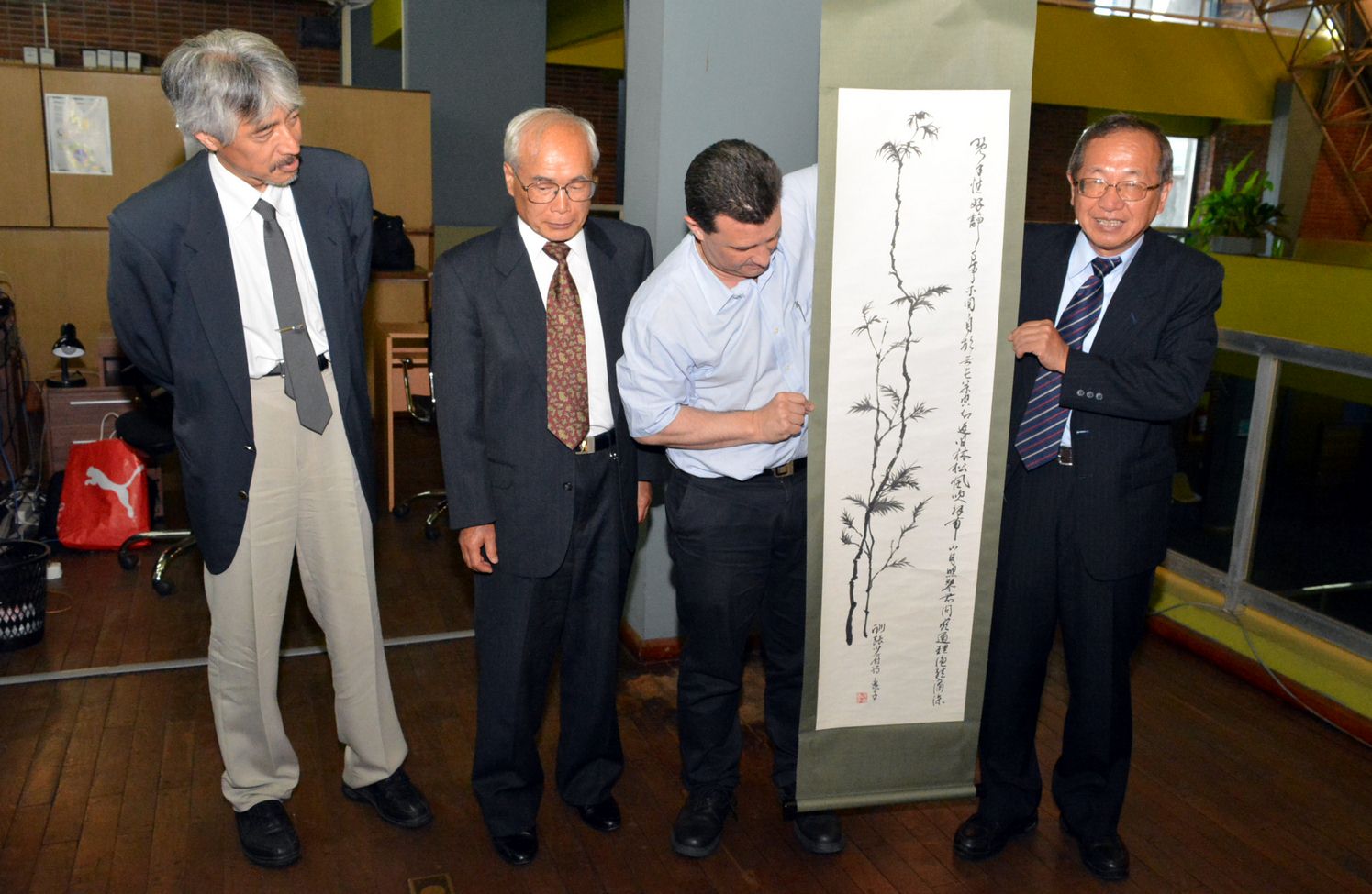 Al final de la reunión, en forma de agradecimiento, se le regaló al Dir. Gral. Alejandro Bertón, un “KAKEJIKU”, caligrafía tradicional de letras japonesas colgante en forma de rollo cuya autora es la Dra. Keiko Wada, facultativa nipona que vive en la ciudad de Porto Alegre.