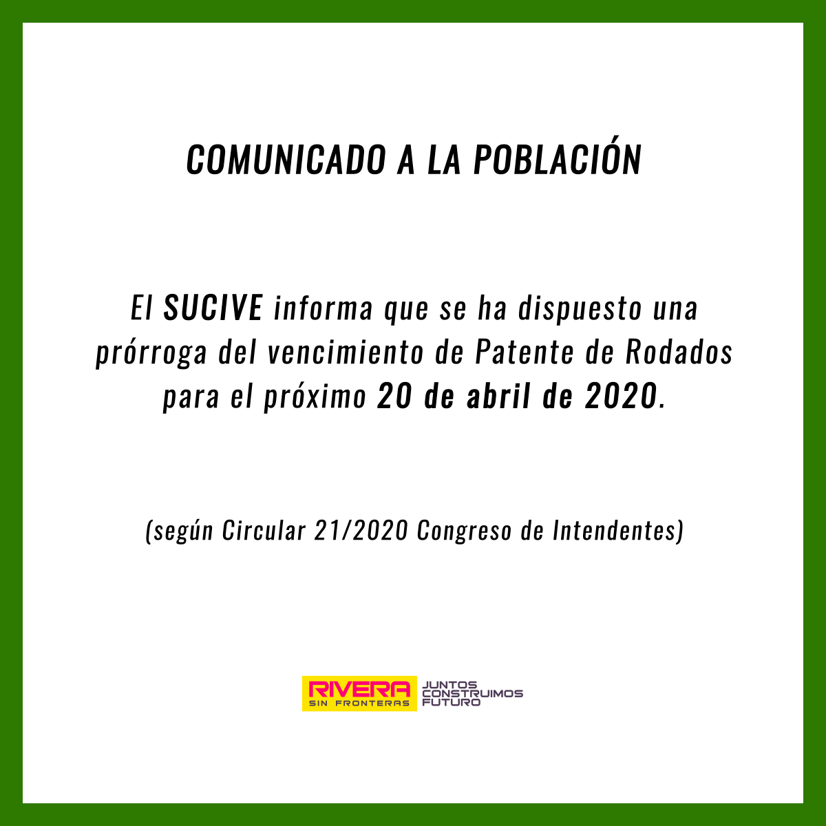 Vencimiento de Patente de Rodados 20 marzo, 202020 marzo, 2020 SUCIVE informa la prórroga del vencimiento de Patente de Rodado, para el próximo 20 de abril del 2020. Share on TwitterTweet Share on LinkedIn Share Send email Mail Print Print
