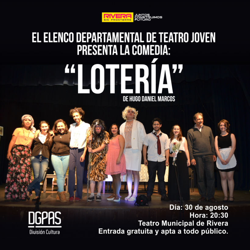 El miércoles 30 de agosto, a las 20:30 horas en las instalaciones del Teatro Municipal, el Elenco Departamental de Teatro Joven dirigida por el Prof. Juan Antonio Ortíz, presenta la Comedia «LOTERÍA» de autoría de Hugo Daniel Marcos