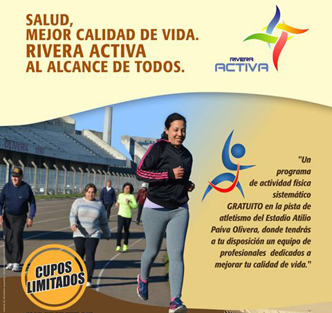 La Intendencia de Rivera, a través de División Deportes y COMERI te invitan a formar parte de “RIVERA ACTIVA”. Un programa de actividad física sistemático y gratuito, en la Pista de Atletismo del Estadio Atilio Paiva Olivera.