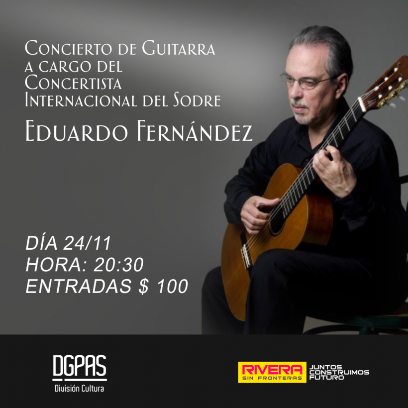 Este viernes 24 de noviembre, el concertista internacional del Sodre, Eduardo Fernández, realizará una presentación en nuestra ciudad. El evento tendrá lugar en el Teatro Municipal de Rivera, a las 20:30 horas, con entrada única a $100.