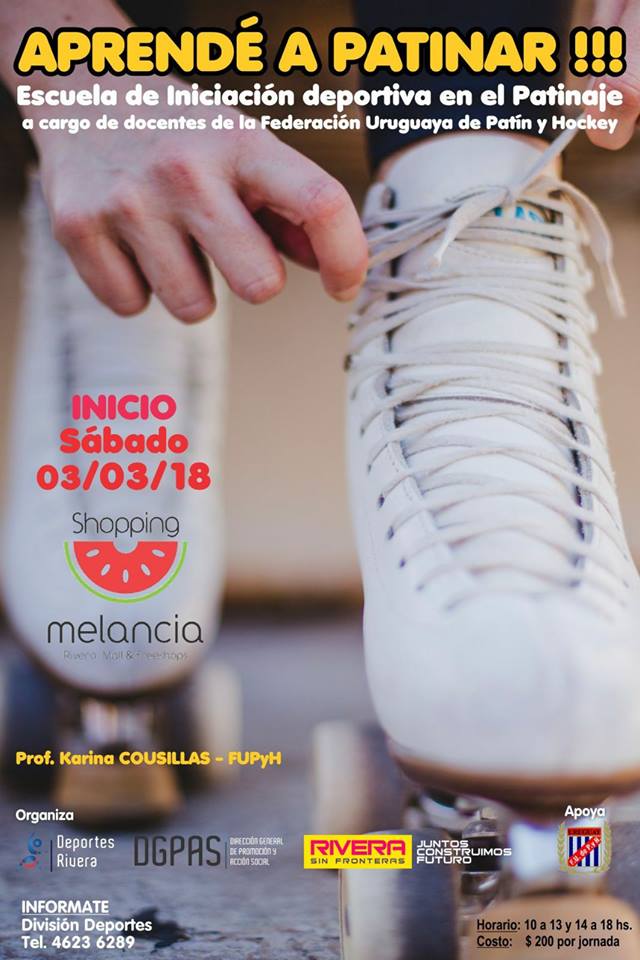 Más deportes para Rivera. División Deportes de la Intendencia Departamental te invita a aprender a patinar con Karina Cousillas, docente de la Federación Uruguaya de Patín y Hockey en el Shopping Melancia. Las clases se realizarán los días sábados iniciando el día 3 de marzo. Horarios: Hasta 7 años – 10:00 a 11:00 horas. De […]