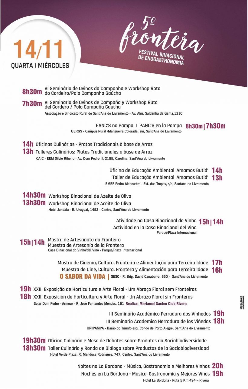 Programación de día 14 noviembre, talleres de Aceite de Oliva y Culinarios a base de Arroz, en el marco del 5º Festival Binacional de Enogastronomía. Por mas información, ingresar en la pagina www.festivalbinacionalenogastronomia.com