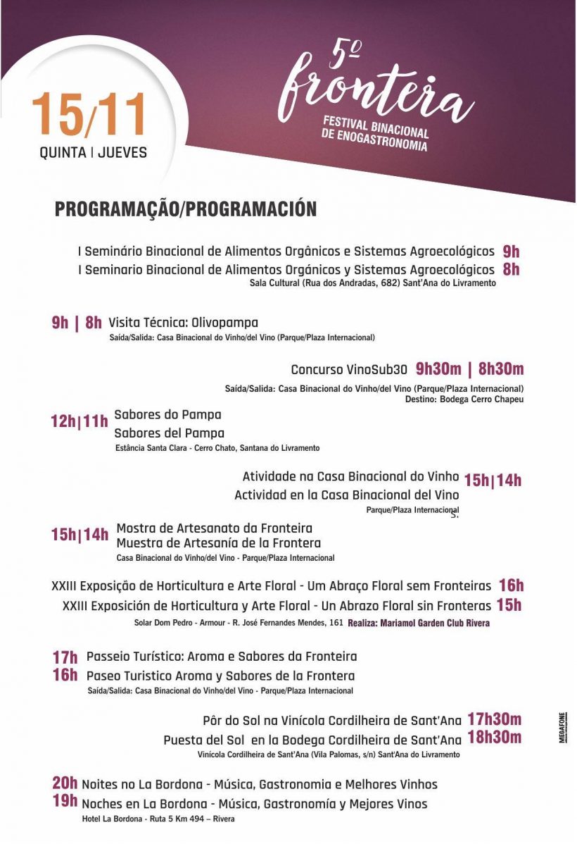 Programación de día 15 noviembre, Visita Técnica a Olivopampa y Seminario de Alimentos Orgánicos y Sistemas Agroecológicos, en el marco del 5º Festival Binacional de Enogastronomía. Por mas información, ingresar en la pagina www.festivalbinacionalenogastronomia.com
