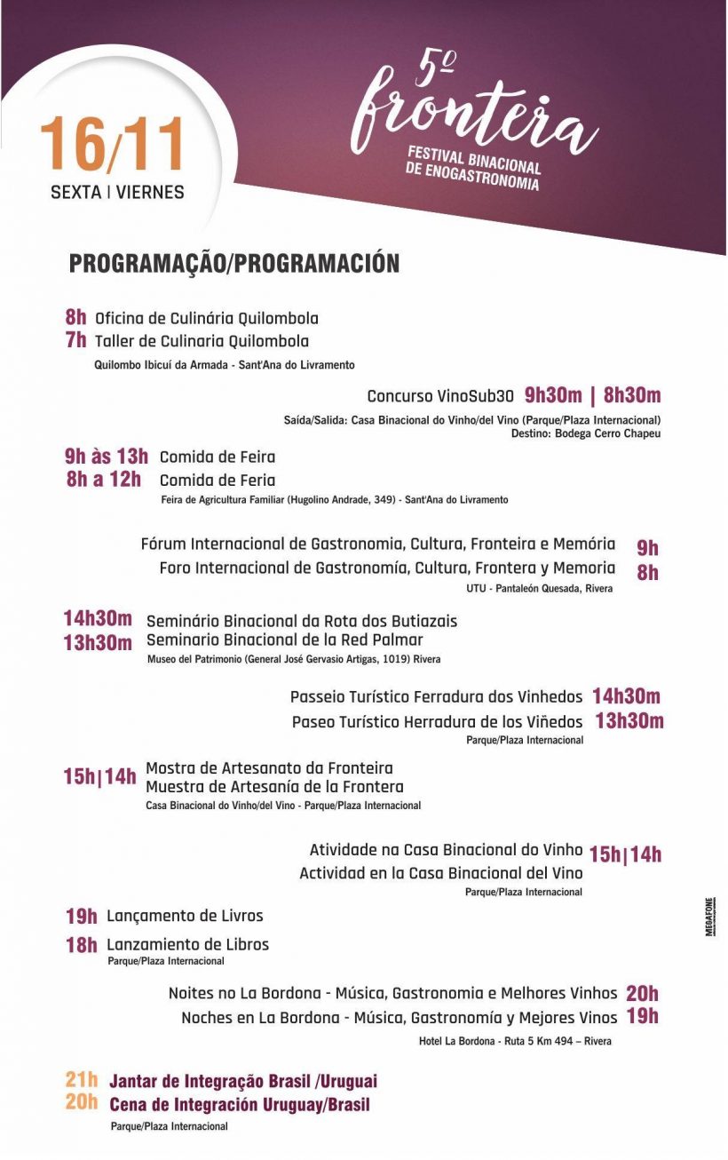 Programación de día 16 noviembre, Seminario de la Red Palmar y Paseo Turístico por Viñedos, en el marco del 5º Festival Binacional de Enogastronomía. Por mas información, ingresar en la pagina www.festivalbinacionalenogastronomia.com