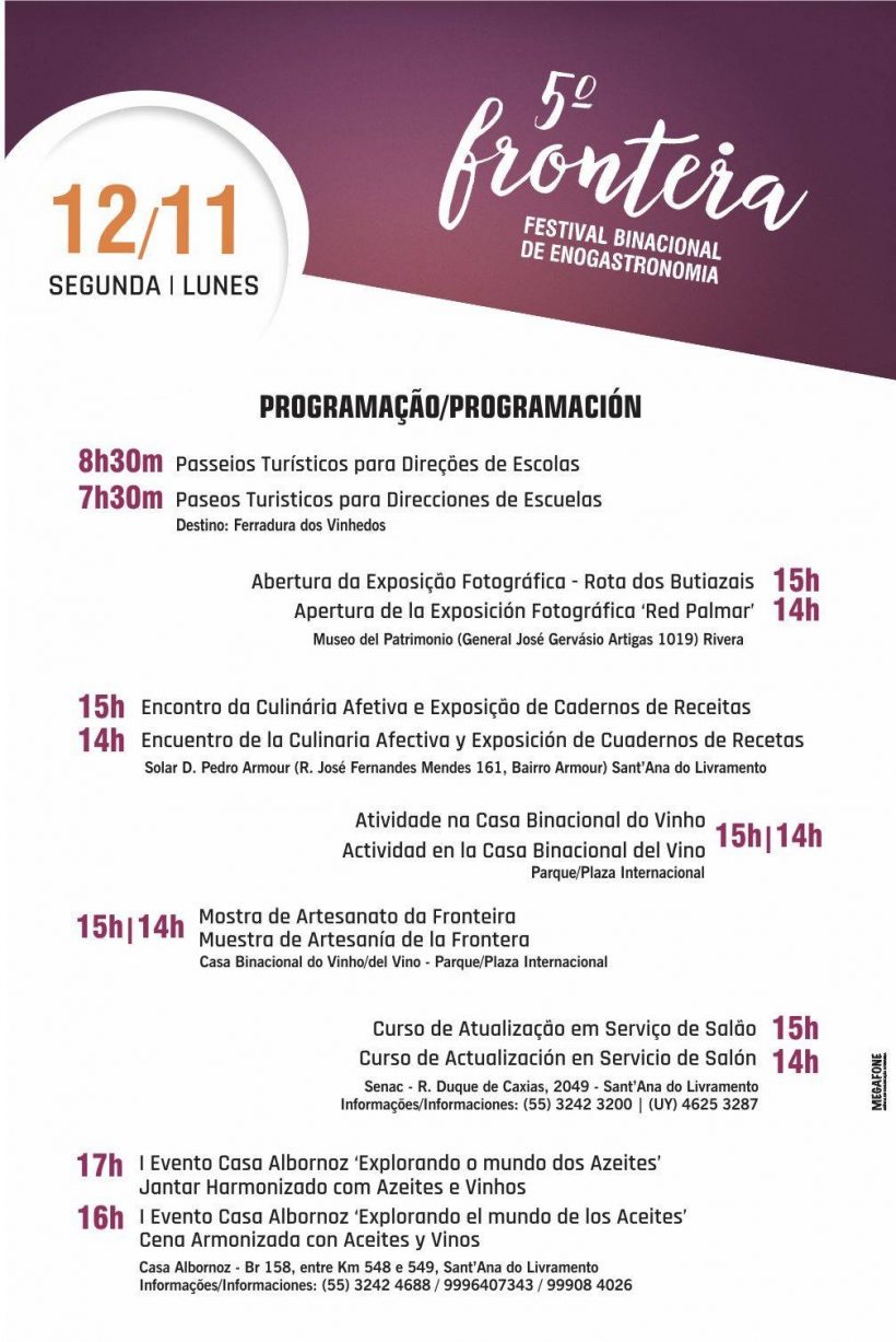 Programación de los días 12 y 13 noviembre, paseos turísticos y talleres, en el marco del 5º Festival Binacional de Enogastronomía. Por mas información, ingresar en la pagina www.festivalbinacionalenogastronomia.com