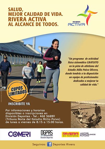 La Intendencia de Rivera, a través de División Deportes y COMERI te invitan a formar parte de “RIVERA ACTIVA”. Un programa de actividad física sistemático y gratuito, en la Pista de Atletismo del Estadio Atilio Paiva Olivera.