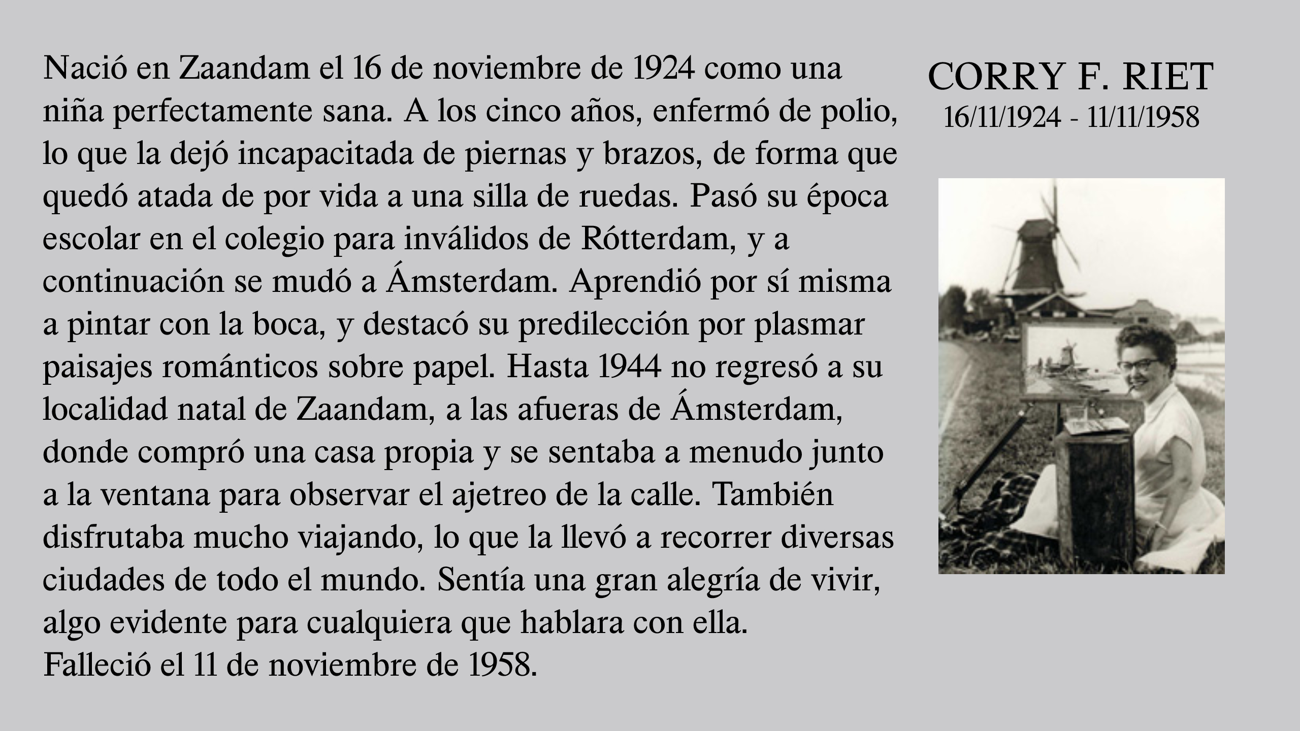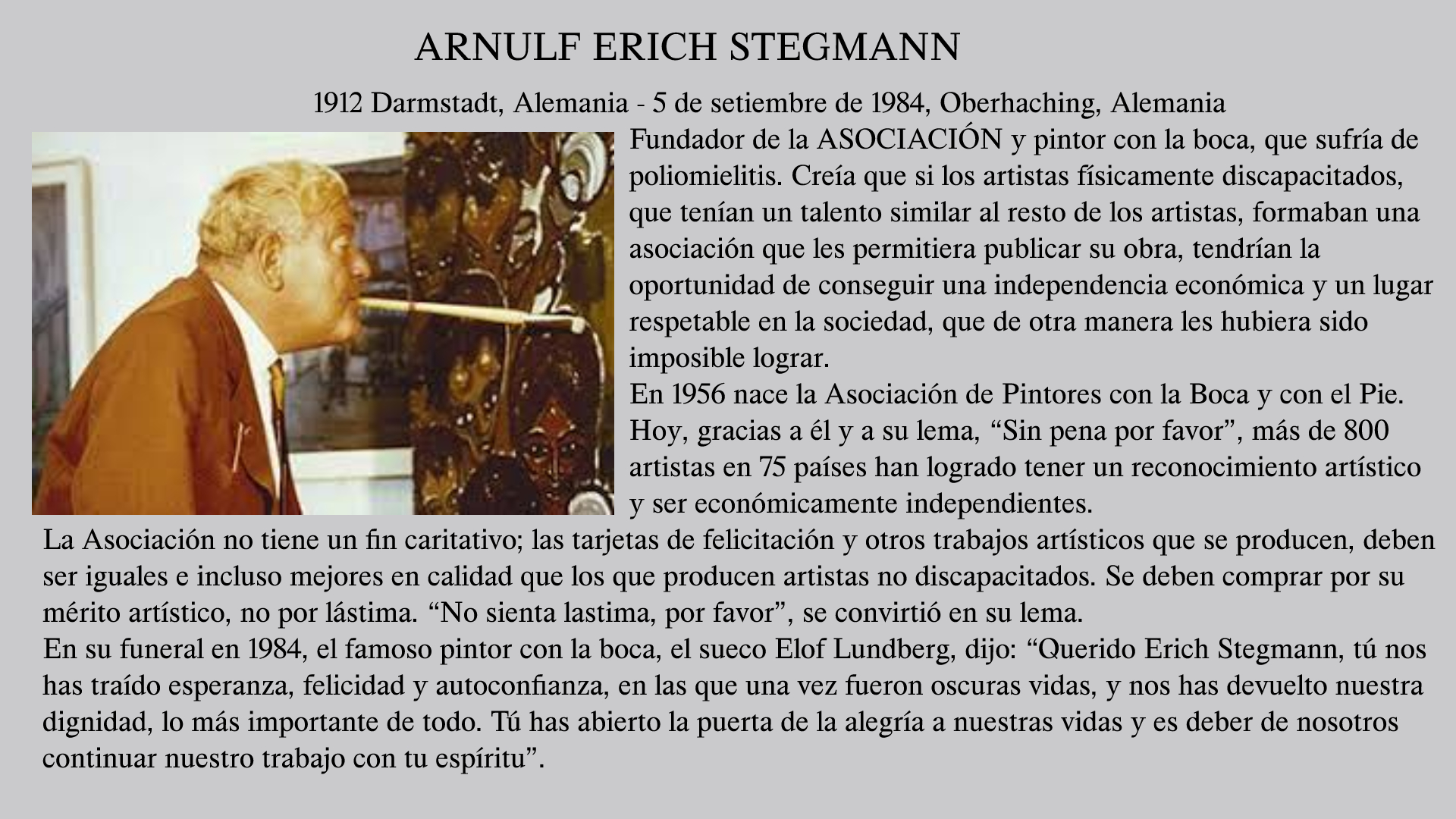 Es difícil imaginar una Asociación tan original en su concepto, tan eficaz en su funcionamiento y con personas tan merecedoras de apoyo como sus miembros. Fue fundada en 1956 por el Señor ARNULF STEGMANN, de nacionalidad alemana, quien a los dos años enfermó de polio, y perdió el uso de sus brazos y de sus piernas. Siendo artista de corazón, aprendió a pintar con la boca y logró fama en todo Europa por la calidad e inspiración de sus obras.