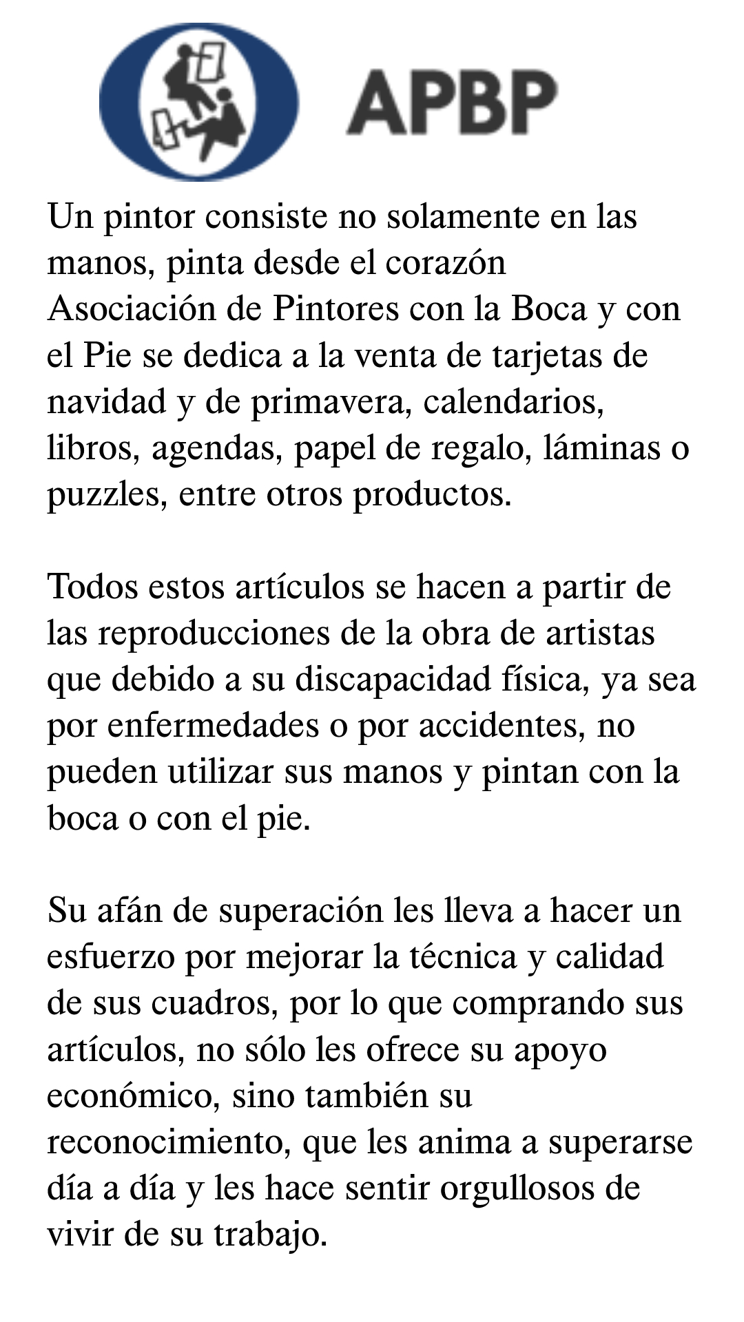 En los últimos años, la ASOCIACIÓN DE PINTORES CON LA BOCA Y CON EL PIE, – APBP– se ha convertido en una organización respetada y pionera en la ayuda al discapacitado, y ha servido de inspiración a otros colectivos de discapacitados en todo el mundo. La ASOCIACIÓN, ayuda de por vida a sus miembros, en un entorno artístico y cultural, donde cada artista puede explorar y desarrollar sus habilidades de forma individual.
