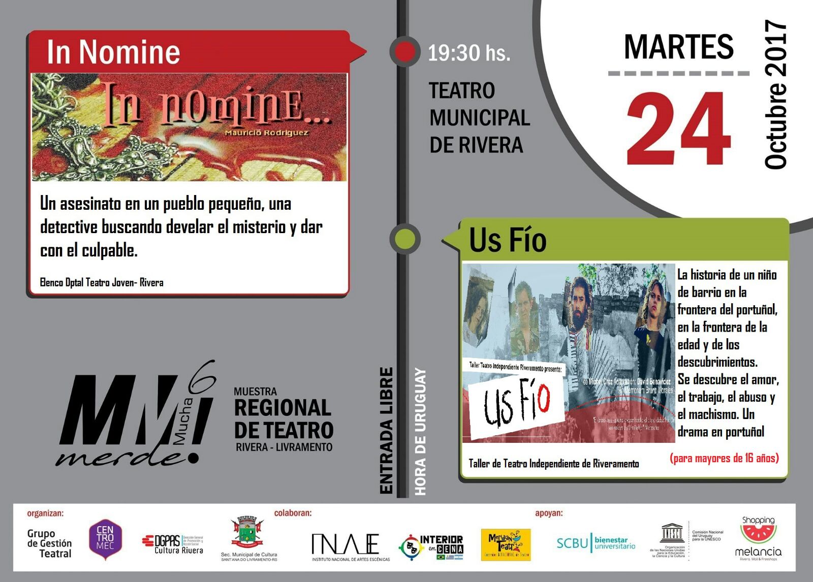 En el marco de la 6ª Muestra Regional de Teatro «Mucha Merde», este 24 de octubre, el elenco departamental de Teatro Joven de Rivera presenta la obra «In Nomine», dirigida por Antonio Ortiz.