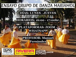 Los días lunes y jueves, a las 16 y a las 17 horas, a través de Zoom, tendrán lugar los ensayos del grupo de danza Mariamol, a cargo del profesor Manuel Fernández (Contacto: 096 710 954) .